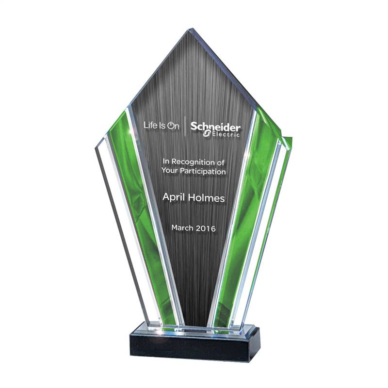 Green accent gem highlighted with polished V-grooves in the deco shaped Lucite. This sits on a black marble base. 3/4 inch thick. Features the Life is On l Schneider Electric logo. Also includes constant copy and up to three lines of personalization.