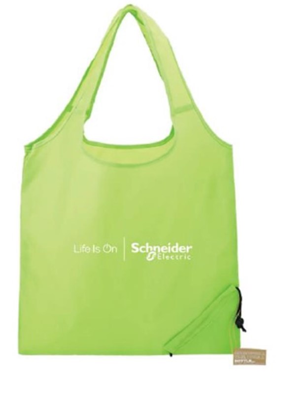 Eco-friendly and convenient. The Bungalow RPET Foldaway Shopper Tote is made from 100% recycled 210D polyester sourced from water bottles. It features an open main compartment with double handles and a unique fold-away design with a drawstring closure for easy storage. Color: Green Material: 100% Recycled Polyester