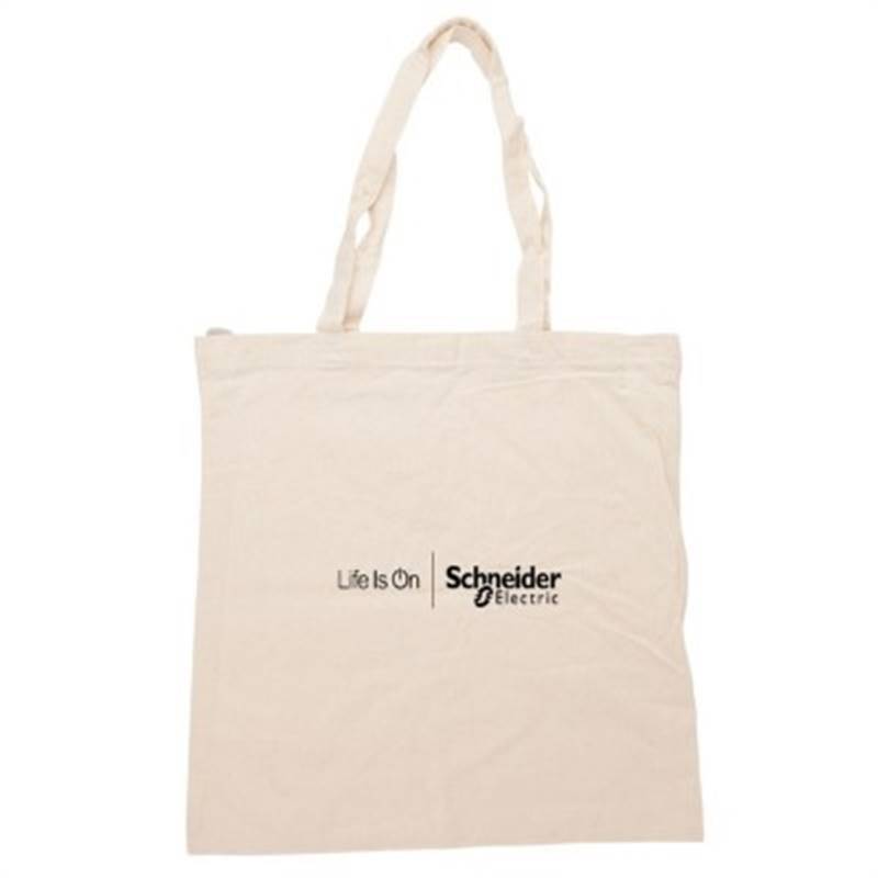 Natural, cotton canvas shopper tote with hook and loop closure and 22" handles. Imprinted with the Life Is On | Schneider Electric™ logo.