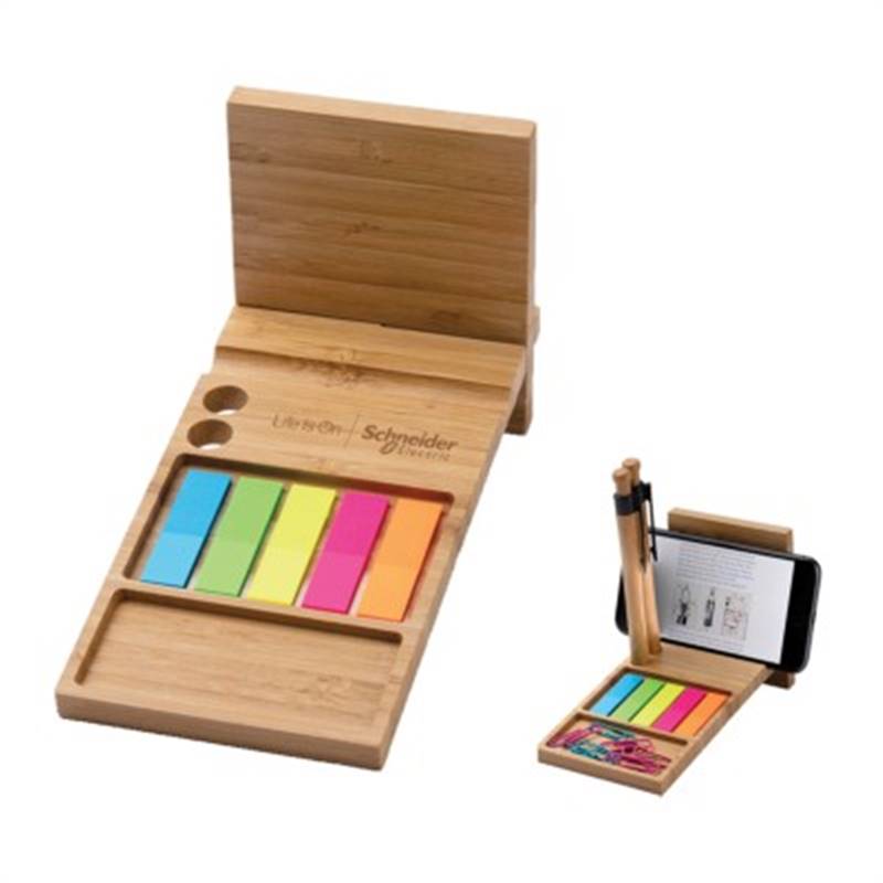 Eco-friendly and functional. The Forest Eco-Lifestyle Bamboo Desktop Organizer is crafted from sustainable bamboo, featuring a phone/tablet stand, a paper clip organizer, two pen holders, and five colors of 25pcs PET flags. This easy-to-assemble organizer ships flat in a gift box, making it a perfect, eco-conscious gift for customers and co-workers. By using bamboo, a renewable resource, this desktop organizer supports a more sustainable lifestyle at work or home.