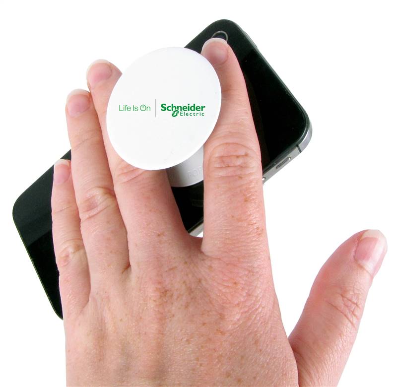 PopSockets stick flat to the back of your phone, tablet or case with a rinseable, repositionable gel. You can lower it for video chat or extend it fully to use as a media stand or photo and texting grip for any brand of phone. Imprinted with the Life Is On | Schneider Electric™ logo.