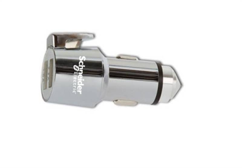 Built to charge, break, and escape. This emergency auto multi-tool can charge your devices. Input: 12V-24V, Output (x1): 5V/2.4A & Output (x1): 5V/1.0A. It can also break your windows with the tungsten steel tip. Lastly, it features a razor-sharp blade for cutting seat belts. Features the Schneider Electric logo.