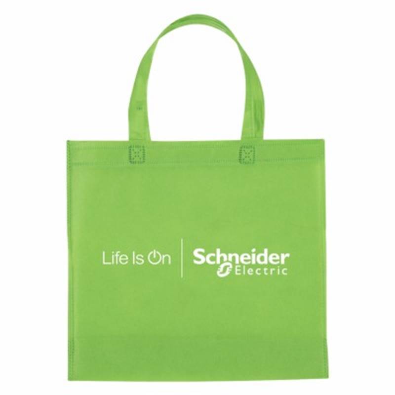 Tote bag made of 80 gram non-woven, coated and water resistant polypropylene. 12.5" handles. Spot clean and air dry only. Decorated with the Life Is On | Schneider Electric™ logo.
