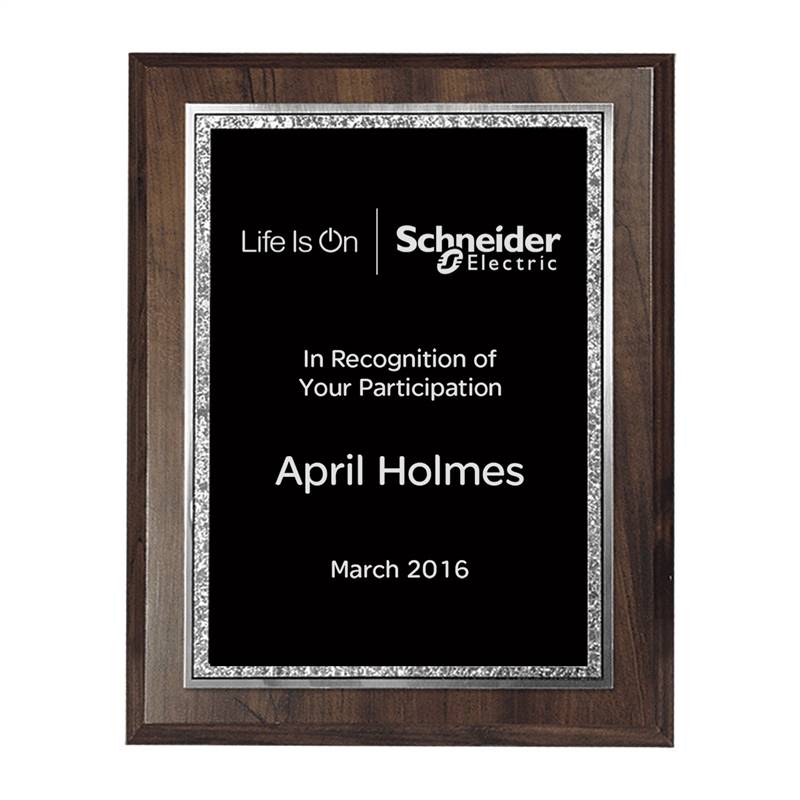 This plaque has a walnut finish with black Florentine design. Available in black with gold Florentine or black with silver Florentine. Features the Life Is On | Schneider Electric™ logo. Also includes constant copy and up to three lines of personalization.
