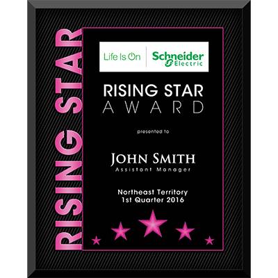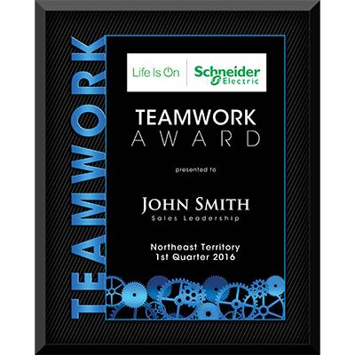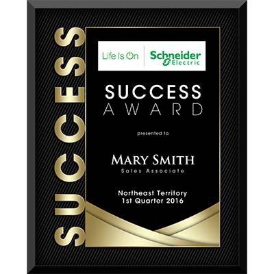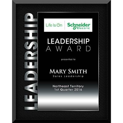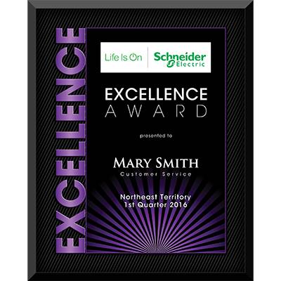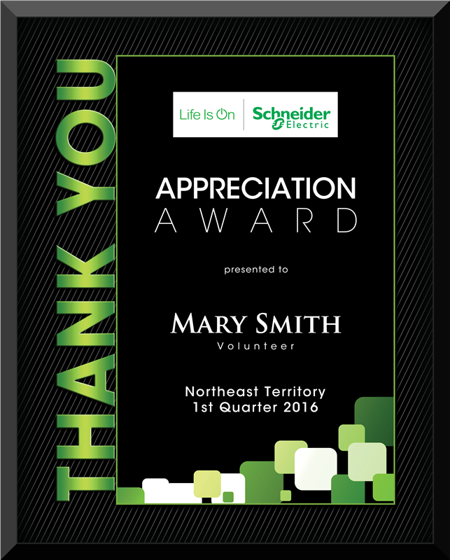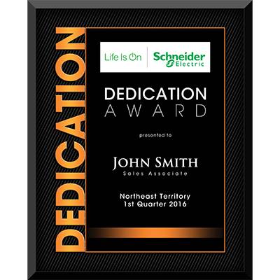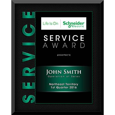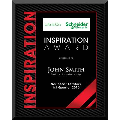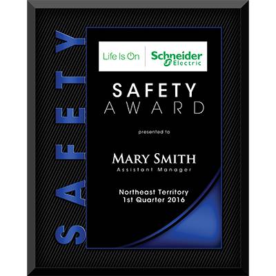 Vibrant full color, high quality laminated plaques featuring an array of color combinations with a sleek infinity edge. Features the Life Is On | Schneider Electric™ logo.. Also includes constant copy and up to three lines of personalization.