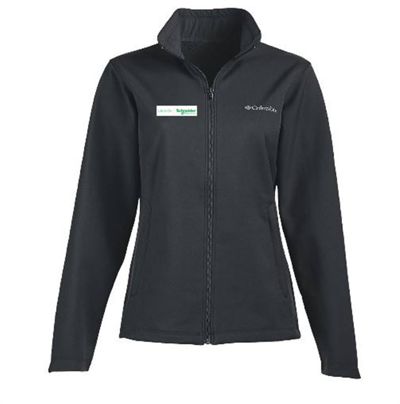 Bonded soft shell jacket. Wind and water resistant. Nexgen contour softshell. 100% polyester. 9.1 oz. Stand up collar. Open, contoured cuffs, full zip front, zippered hand pockets. Figure flattering princess seams. Drawcord adjustable hem. Embroidered with the Life is On|Schneider Electric™ logo