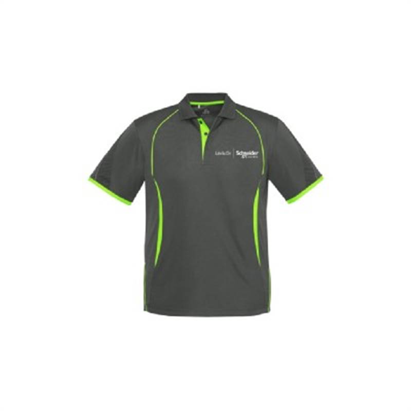 100% Polyester sports interlock fabric. 4.6 oz. Excellent UPF rating. Features grid mesh underarm panels for breathability. Embroidered with the Life Is On | Schneider Electric™ logo.