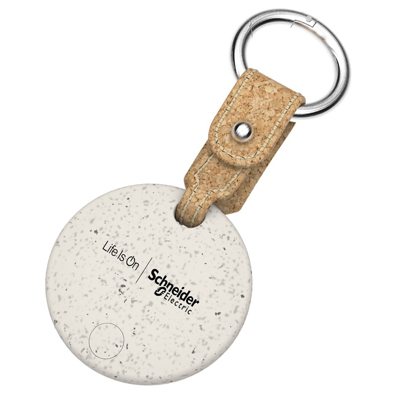Eco-friendly and functional. This Bluetooth tracker is made with recycled PCR plastic and wheat straw, both sustainable materials that help reduce waste. It works with the Spot 2.0 Bluetooth Finder app and features a cork keychain and round metal carabiner. With Bluetooth 5.2 and a range of 200 feet, it combines eco-conscious design with convenience. Imprinted with the Life Is On | Schneider Electric™