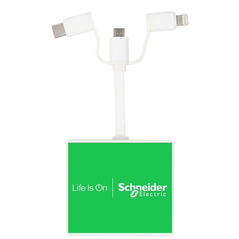 Eco-conscious and efficient. The Swan Charger is a UL Listed 3000mAh Power Bank designed to be rechargeable, reusable, and eco-friendly. It provides up to 80% phone charge and features a 3000mAh lithium polymer battery, compatible with Apple® Lightning®, Micro-USB, and Type-C devices. With an approximate charging time of 3 hours, it powers your earbuds, phones, and speakers efficiently, reducing the need for disposable power sources and promoting sustainable energy use. Branded with the Life Is On | Schneider Electric™ logo.