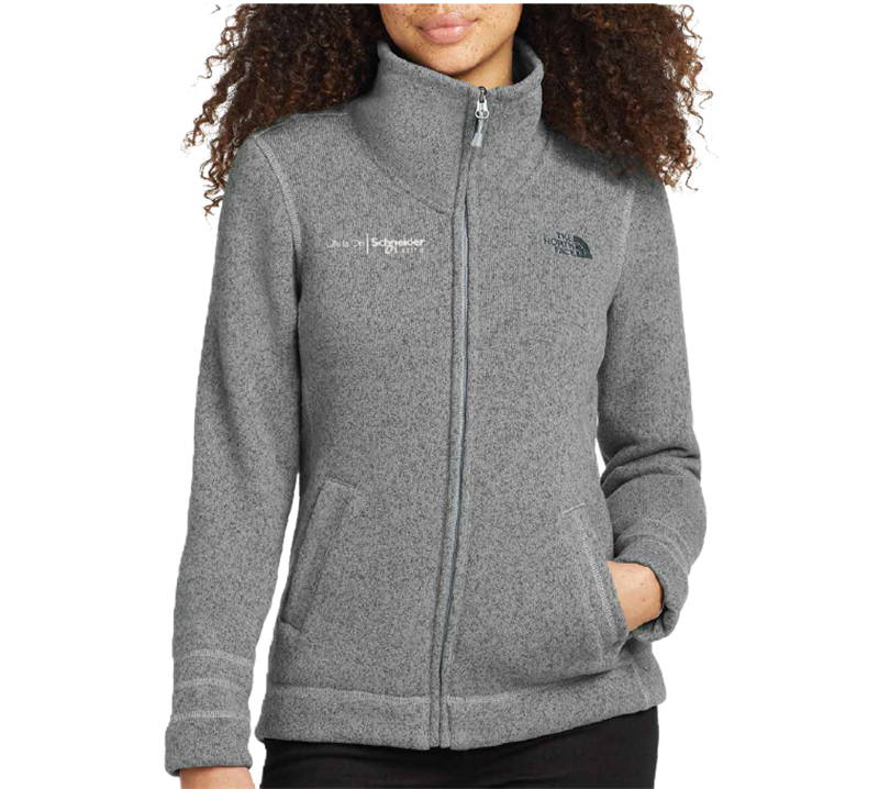 Cozy up in sustainable style with this women's heavyweight fleece jacket, crafted for warmth and breathability. In TNF Medium Grey Heather and featuring the Life Is On | Schneider Electric logo, this jacket blends a soft, sweater-knit exterior with a brushed fleece interior for ultimate comfort. Made from 53% recycled polyester, it includes a reverse-coil front zipper, zippered hand pockets, and a secure-zip chest pocket for added functionality. Finished with The North Face contrast logo on the chest, it's the perfect layer for casual wear or cool-weather adventures.