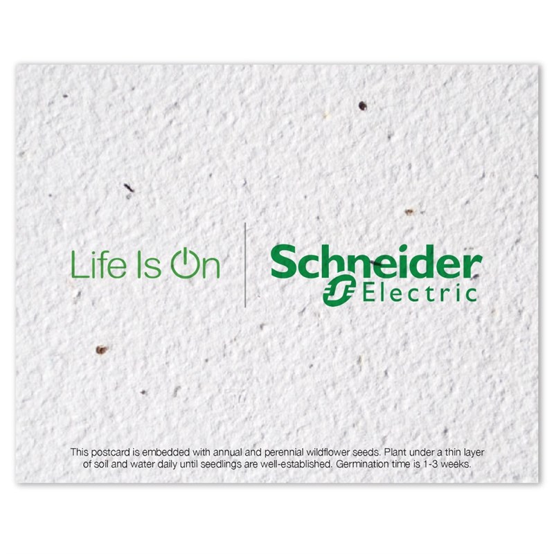 Eco-friendly seed paper card with the "Life is On" Schneider Electric logo. Printed on 100% recycled paper with wildflower seeds—plant, water, and watch it bloom!