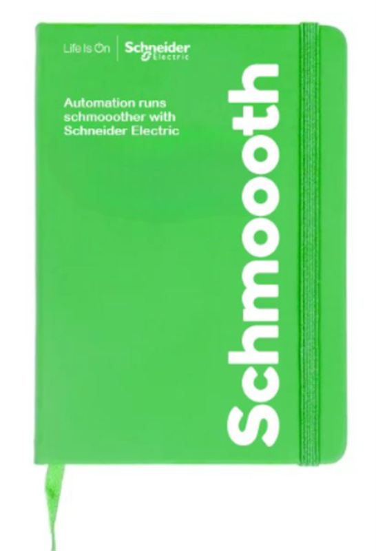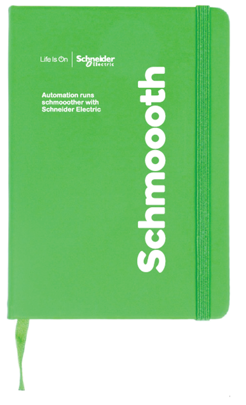 The Stratford Sustainable Notebook in vibrant lime green features the Schmoooth automator design alongside the “Life Is On | Schneider Electric” logo. Crafted from eco-friendly materials, it’s both stylish and responsible—perfect for capturing ideas, notes, or meeting insights while supporting sustainability in action.