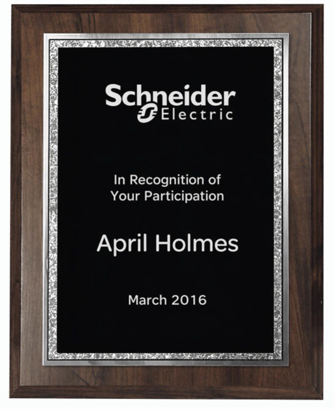 Vibrant full color, high quality laminated plaques featuring an array of color combinations with a sleek infinity edge. Features the Schneider Electric? logo.. Also includes constant copy and up to three lines of personalization.?