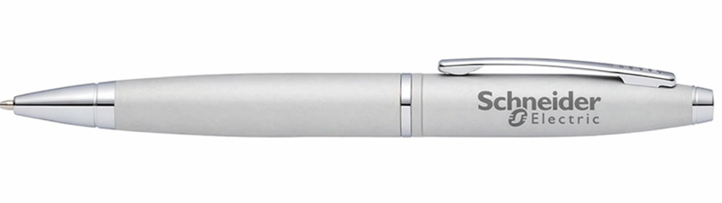 Calais Satin Chrome Ballpoint Pen. With Art Deco inspired lines and striking two-toned finishes, the Calais Collection is an instant classic. Lightweight, sleek, with chrome accents and a bold profile, it brings a crisp, clean look to the table every time. Engraved with the Schneider Electric? logo. Color: Chrome