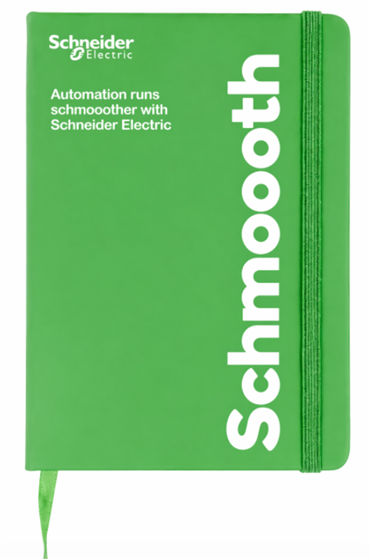 The Stratford Sustainable Notebook in vibrant lime green features the Schmoooth automator design alongside the “Schneider Electric” logo. Crafted from eco-friendly materials, it’s both stylish and responsible—perfect for capturing ideas, notes, or meeting insights while supporting sustainability in action.