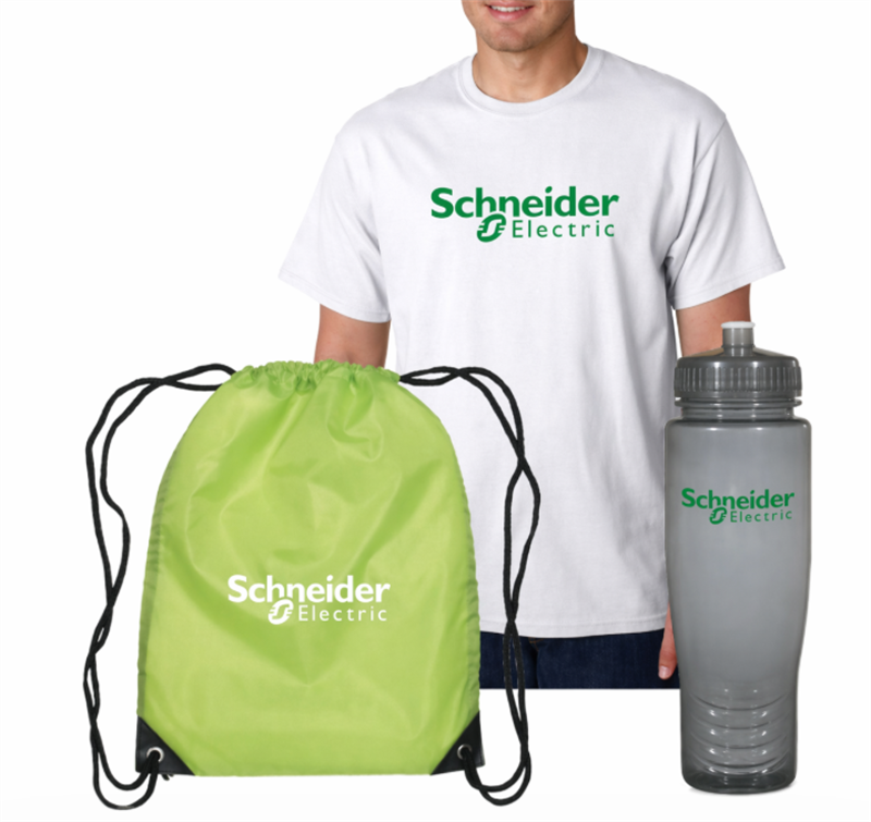This kit features a white Gildan t-shirt, a lime green sports pack, and a translucent smoke Poly-Clean 28 oz. bottle. Each item is imprinted with the Schneider Electric logo.