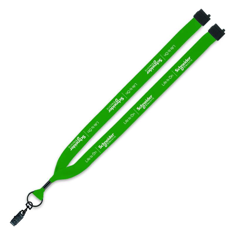 3/4" Polyester lanyard with bulldog clip and plastic breakaway release. Imprinted with the Life Is On | Schneider Electric™ logo.