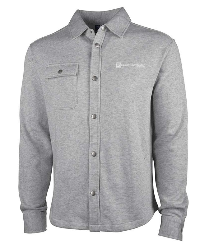 Full placket shirt jacket with a center-front opening and self-fabric collar. Equal parts sweatshirt and jacket come together for a casual, elevated look. Relaxed fit and mid-weight warmth make this a great transitional piece. Made of 60% cotton/40% polyester fleece. Embroidered with the Square D and Life is On l Schneider logo. Color: Heather Gray